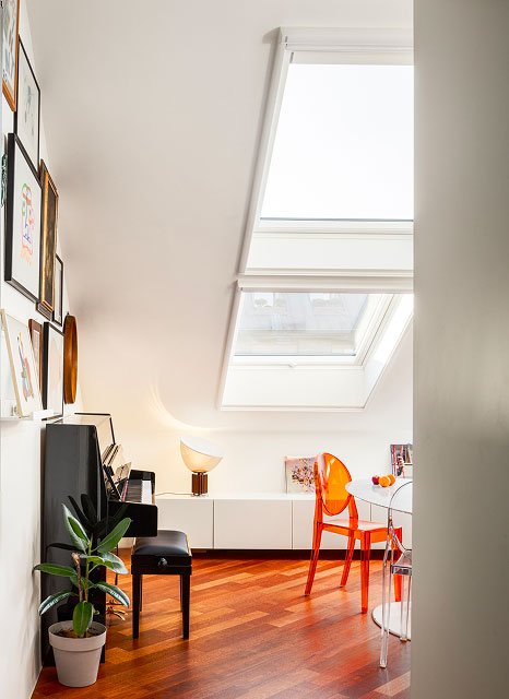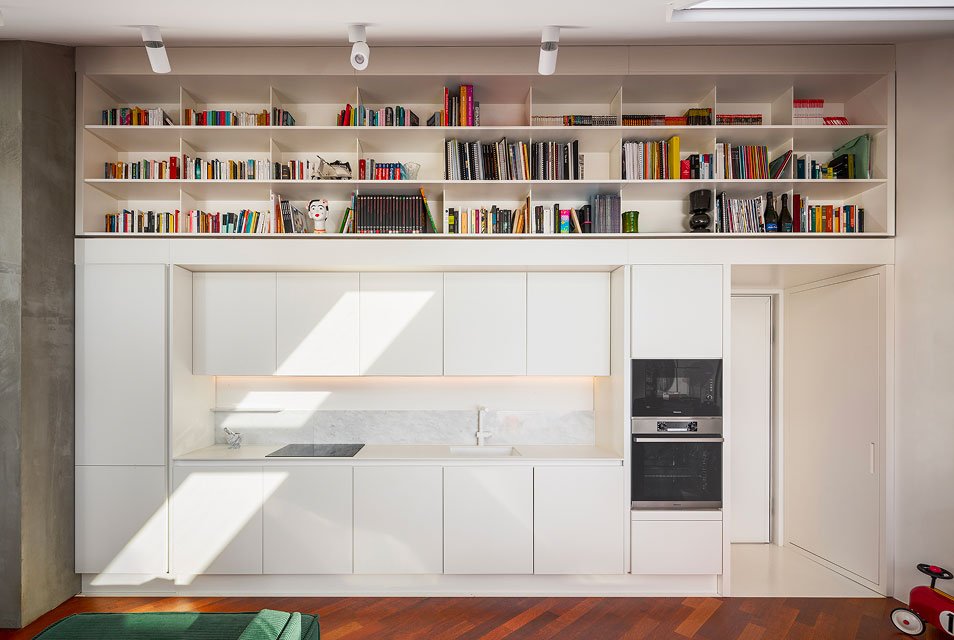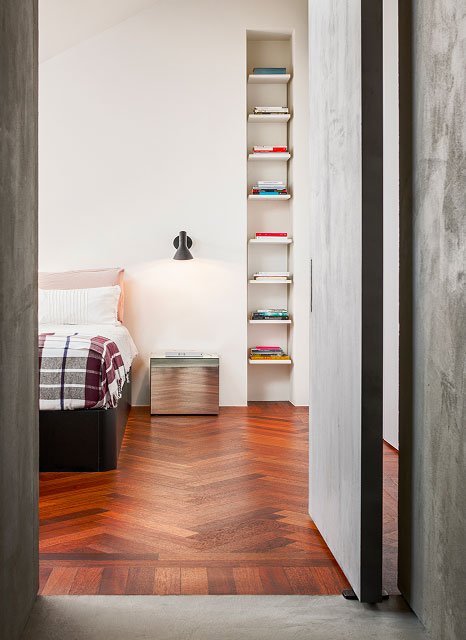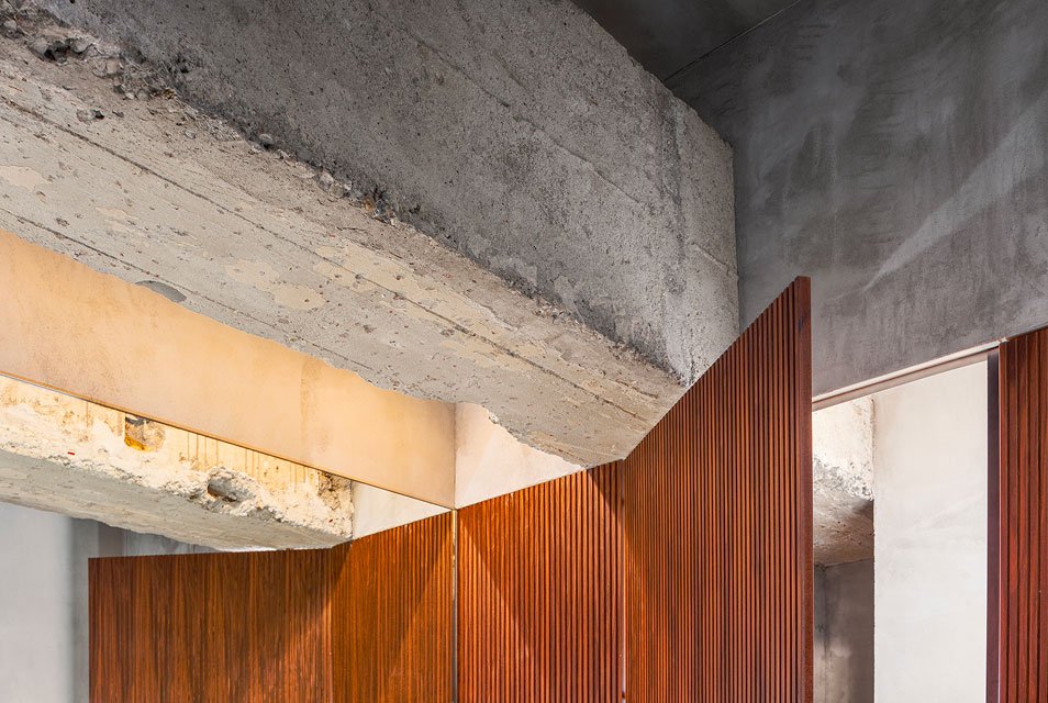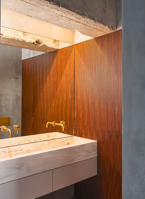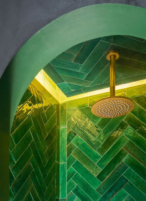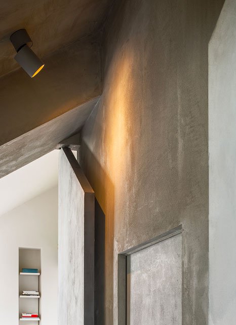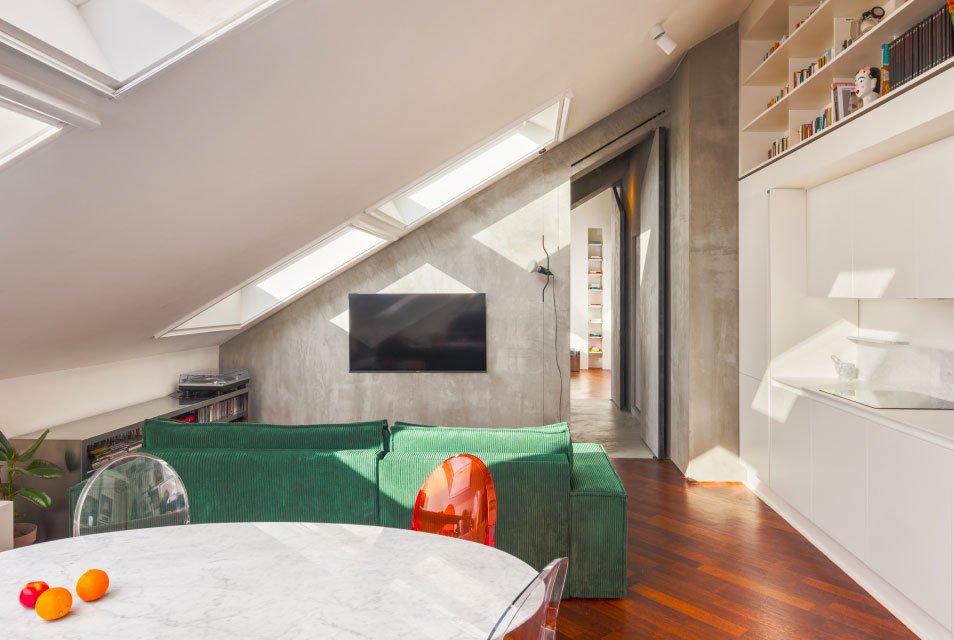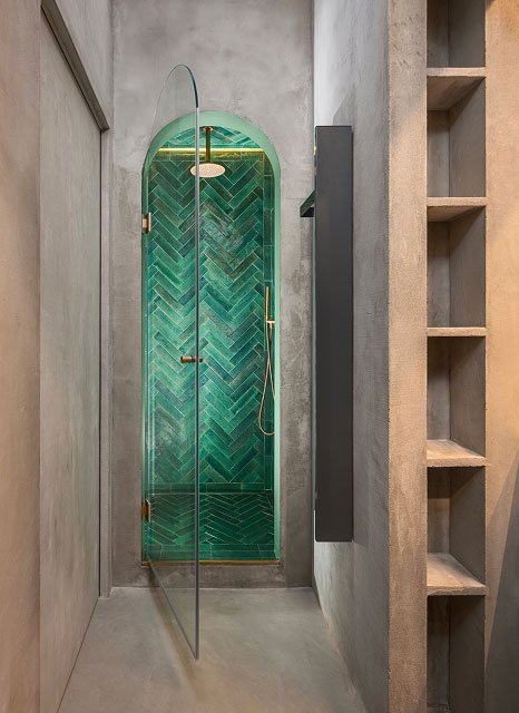 Casa GvaC si sviluppa attorno a un volume architettonico in cemento che connette la zona giorno e la zona notte, integrando nuovi spazi funzionali. Questo monolite materico, rifinito in intonachino e resina, crea un contrasto raffinato con il parquet originale restaurato e i dettagli in ottone anticato. La luce zenitale, amplificata dai nuovi lucernai, valorizza la matericità delle superfici. Il soggiorno è dominato da una parete attrezzata che integra cucina e libreria sospesa. Nel bagno, una doccia scenografica con apertura ad arco, rivestita in piastrelle verde bosco a spina di pesce, avvolge lo spazio in un’atmosfera intima e riservata.