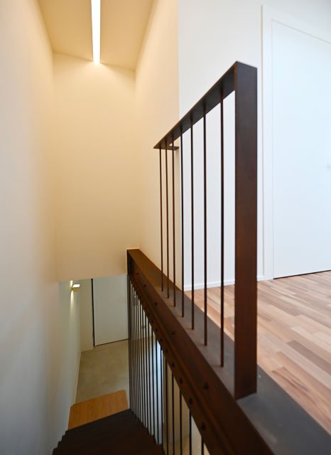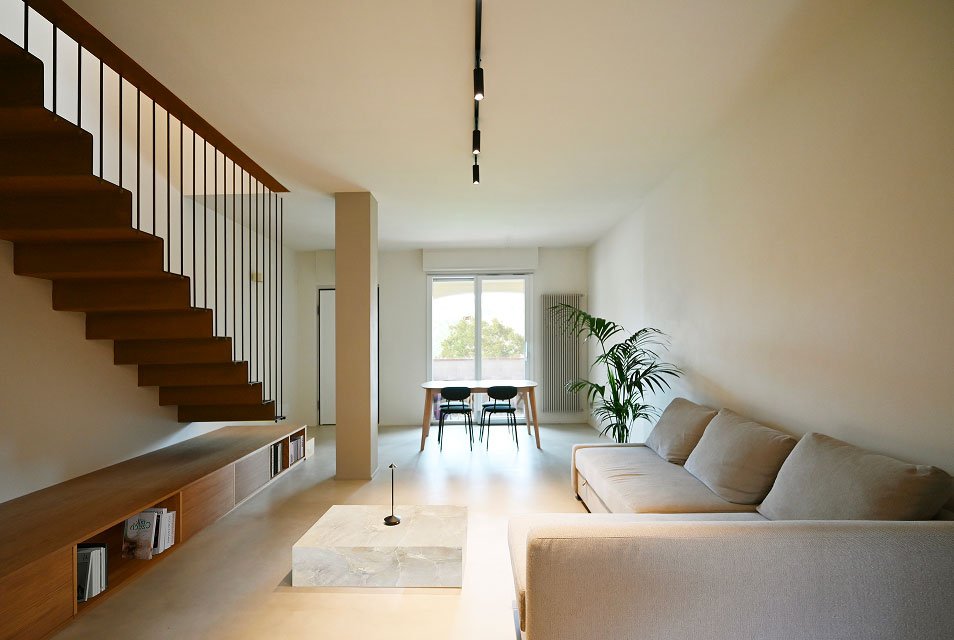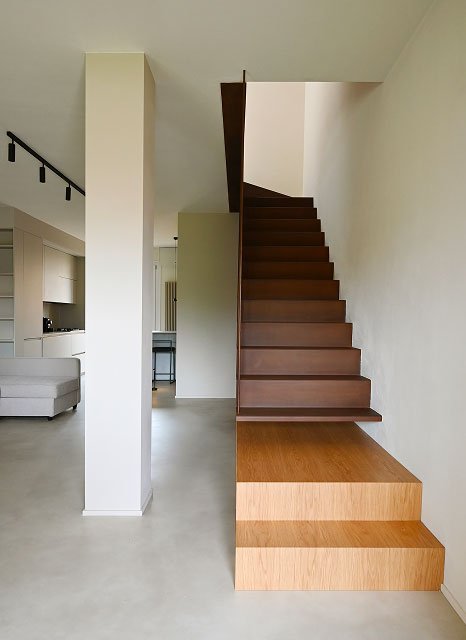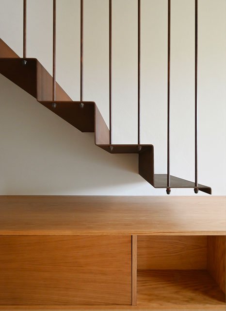 In questa casa contemporanea a pochi passi dal centro di Arezzo, il progetto di una scala prende forma come una piccola architettura, creando la scenografia di un contesto volutamente lasciato neutro. Accostata a una parete del living, emerge linearmente tra pavimenti chiari, pareti dalle nuance delicate e arredi sobri. La prima parte realizzata in rovere naturale funge da pedana bassa con ripiani a giorno e cassetti nascosti, discreta e funzionale. La seconda, sospesa in acciaio corten come un’arpa, fluttua nel vuoto, sostenuta da sottili tondini metallici, creando un contrasto intenso e una leggerezza visiva quasi musicale. Il vuoto tra le due sezioni offre respiro e allo stesso tempo tensione, trasformando ogni gradino in un’ esperienza sensoriale di suono e materia.