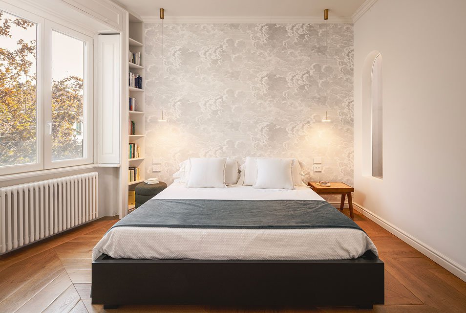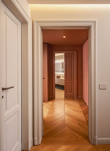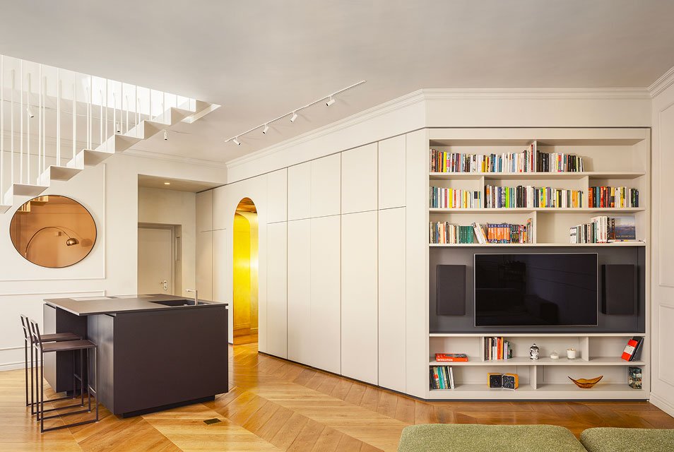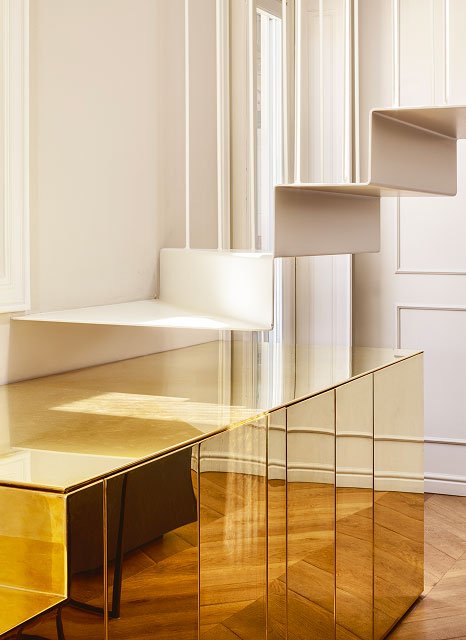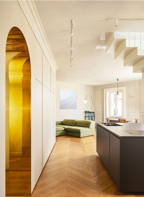 Casa MJo è un progetto di rinnovamento radicale di una residenza degli anni '30, che unisce elementi contemporanei a dettagli classici. Il nuovo layout trasforma tre ambienti in un ampio spazio giorno di 50 mq, affacciato sul quartiere Garibaldi. La cucina, la scala contenitrice e la parete attrezzata, che si estende lungo l’intera casa, definiscono l’architettura dell’ambiente. Materiali e cromie differenti creano giochi di prospettive, con un equilibrio raffinato tra pietra, ferro bianco, legno e accenti di ottone riflettente. Il bagno ospiti è ispirato agli interni parigini mentre il bagno padronale rievoca le atmosfere di un hammam di altri spazi e altri tempi. Un arco in ottone a tutto sesto invita ad entrare nella zona notte dall’ atmosfera elegante e contemporanea.