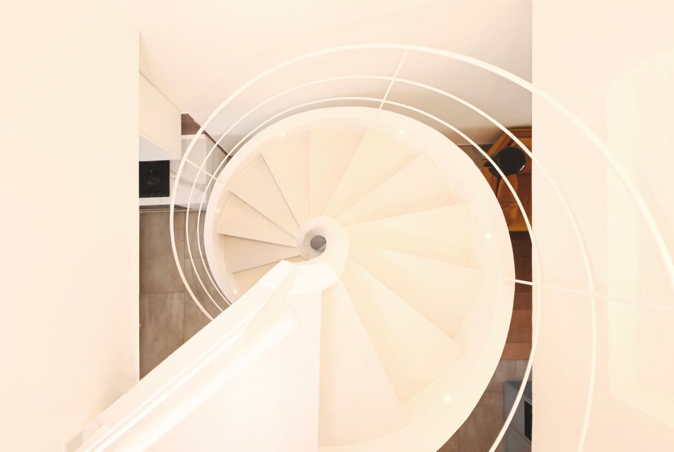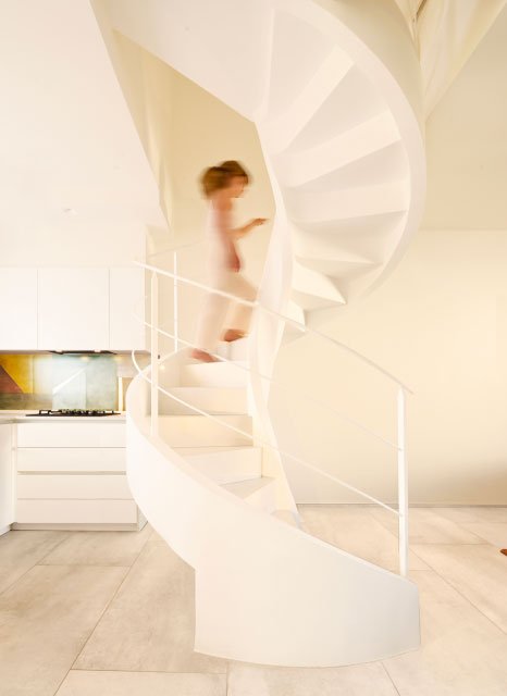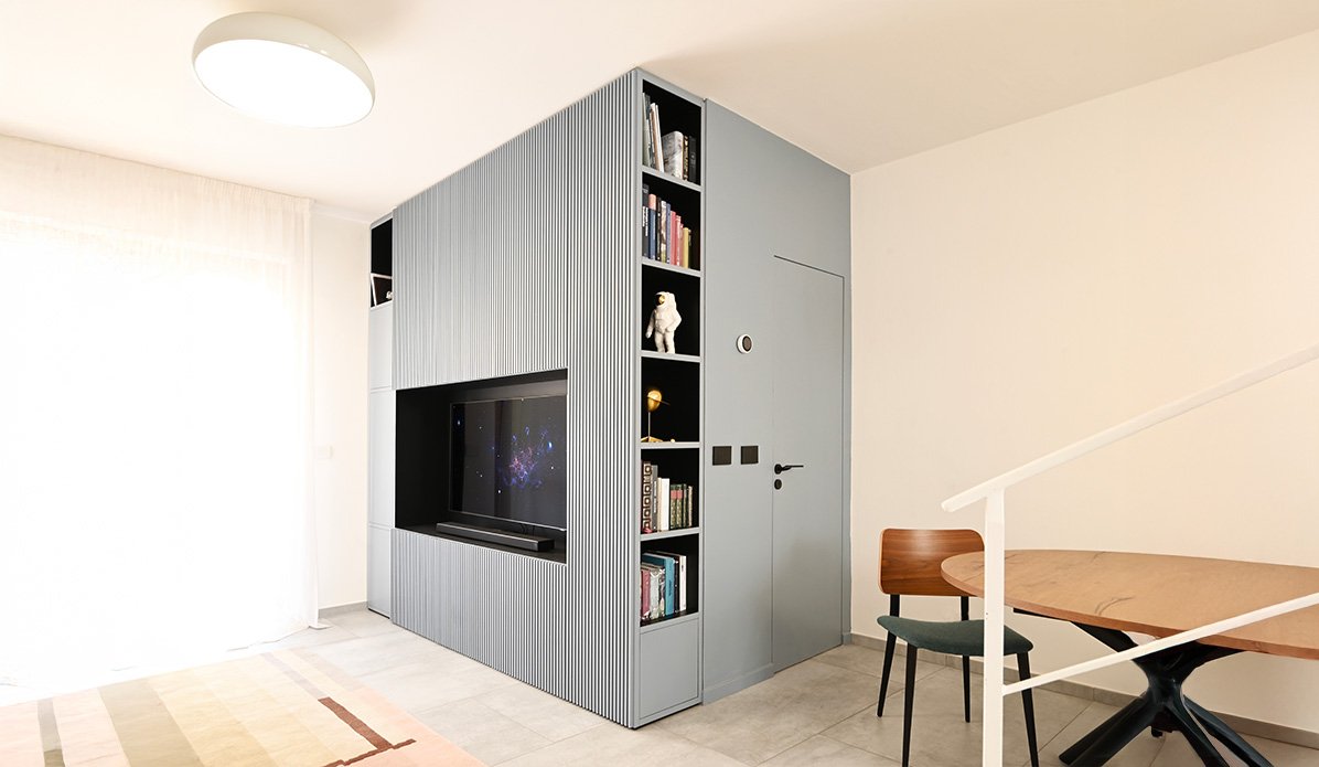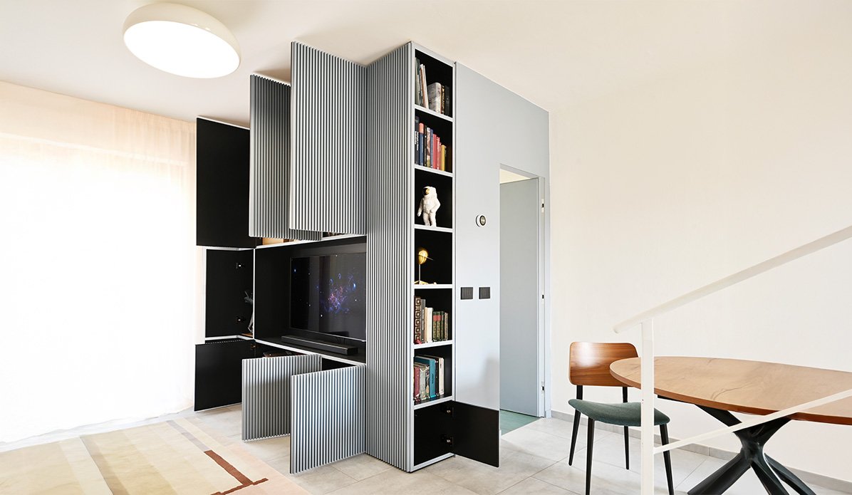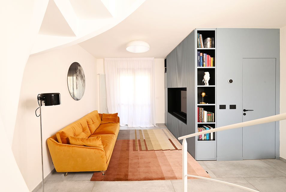 Casa Na è una residenza progettata per una giovane coppia, con l'obiettivo di trasformare un appartamento di 70 mq in uno spazio fluido e funzionale. Il progetto di ristrutturazione elimina la scala a fazzoletto, creando una continuità tra cucina e salotto grazie all'inserimento di una scala a chiocciola più compatta, dal profilo scultoreo in cemento armato bianco con dettagli in ferro battuto e pietra. Un elemento iconico, la "Scudo Capsula", arricchisce l'open space. Ispirata allo spazio, questa struttura si integra con la scala e bilancia l'ambiente, grazie ai suoi colori vibranti e al design dinamico. Gli interni sono caratterizzati da una palette cromatica che richiama gli anni '70, con colori vibranti come ocra, rosa, viola e blu petrolio, che si fondono in un ambiente elegante ma vivace. Casa Na è un'esperienza sensoriale, dove luce e spazio si combinano in modo inaspettato.